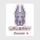 The University at Albany Great Dane mascot logo features a stylised depiction of a Great Dane's head. The dog is illustrated with sharp, bold lines in purple and grey, giving it a fierce, confident expression. The ears stand tall, symbolising alertness and strength. Underneath the Great Dane head is the word "UAlbany" written in bold, blocky golden letters outlined in purple, reinforcing the university's branding. This design represents UAlbany's sports teams, highlighting power, loyalty, and determination.