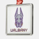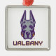 The University at Albany Great Dane mascot logo features a stylised depiction of a Great Dane's head. The dog is illustrated with sharp, bold lines in purple and grey, giving it a fierce, confident expression. The ears stand tall, symbolising alertness and strength. Underneath the Great Dane head is the word "UAlbany" written in bold, blocky golden letters outlined in purple, reinforcing the university's branding. This design represents UAlbany's sports teams, highlighting power, loyalty, and determination.