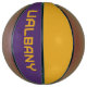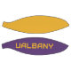 The University at Albany wordmark features bold, geometric typography in purple with gold outlines. The text is written in all capital letters, forming a strong and modern style that emphasises the university's identity. The angular lines and sharp edges of the font create a sense of power and professionalism. The gold outline adds a touch of prestige and visibility, making the wordmark stand out on both light and dark backgrounds. This design is perfect for branding athletic teams, merchandise, and university-related media.