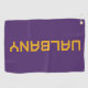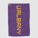 The University at Albany wordmark features bold, geometric typography in purple with gold outlines. The text is written in all capital letters, forming a strong and modern style that emphasises the university's identity. The angular lines and sharp edges of the font create a sense of power and professionalism. The gold outline adds a touch of prestige and visibility, making the wordmark stand out on both light and dark backgrounds. This design is perfect for branding athletic teams, merchandise, and university-related media.