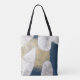A large abstract shape in navy blue covers the canvas edge to edge with cutouts revealing a textured white background. A worn, textured beige area sits over the blue shape while white lines twist like rope in a dynamic finish to the piece.