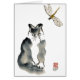 Kitten is playing in the yard by the water feature when in zooms a dragonfly - an unpalatable insect. Sumi-e, Zen ink painting by Ellen Miffitt aka Nine Lives Studio