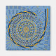 This concentric circle design was created to represent the feeling of a normally orderly world unraveling and falling apart, with a broken chain surrounding the image and shapes leaking out. Two background images have been provided, with the blue version currently visible.