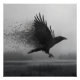 A solitary raven launches into a foggy landscape, its dark wings dissolving into a storm of tiny birds that scatter across the sky. The monochrome palette and cinematic composition give this piece a haunting, dreamlike quality, perfect for fans of ravens, dark fantasy, and moody atmospheric art prints.