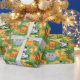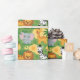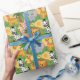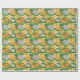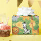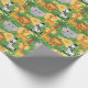 Unrolled gift wrap with a playful jungle theme featuring repeated patterns of cartoon lions, zebras, and elephants on a green leafy background.