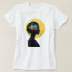 This T-shirt features a striking design of a woman's silhouette filled with a vibrant sunset scene, complete with palm trees and a tranquil ocean view. The silhouette is set against a bold yellow circular background, creating a visually appealing contrast. Made from soft, high-quality cotton, this shirt offers a comfortable fit and is perfect for casual wear. Available in multiple sizes, this T-shirt is a great choice for those who appreciate unique, artistic designs.