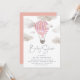 Celebrate your sweet babe on the way with this chic and simple baby shower invitation in soft pink and peach watercolors. Design features a hot air balloon illustration floating amid fluffy clouds, with your event details beneath in smoky blue grey lettering.