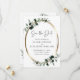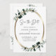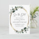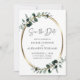 Updated QR Code Eucalyptus Gold Metallic Wedding Save the Date Invitation... Our luxe botanical Save the Date card features a gold metallic oval frame embellished with dusty green and emerald-hued eucalyptus leaves creating a natural looking border for the announcement text within. The back of the card contains your wedding website information and a QR code graphic template you can replace with your own code simply by typing your wedding website URL. All example text (except for Save the Date) can be easily revised with your own details on the personalisation template.