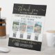 Provide contactless payment convenience and say thank you to customers with a custom QR code and logo "Scan to Pay" tabletop pedestal sign. All wording on this template is simple to personalise or delete. The colours, fonts and logo transparency are also are easy to customise using the Zazzle design tool. The scannable codes make it easy for customers to make a purchase using a payment app. The modern black, white and gold design features stylish script calligraphy, elegant minimalist typography, your corporate logo branding, and 4 product images with QR codes. Please note that gold is printed colour, not metallic foil. Suitable for small businesses as well as large corporations, this company branded sign provides modern convenience to clients with chic professional style.