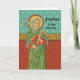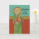 Wish a Joe, Joseph, or Josephine "A Happy Name Day" with a card from Saints_Aplenty! + In this detail of a 19th-century Belgian devotional print, a mature, grey-haired St. Joseph stands in front of a red wall hanging with golden yellow trim. The tapestry is patterned with equal-armed crosses enclosed in rotated squares. How it is hung defies logical explanation because the background consists of an infinitely deep aqua-blue sky bespattered with stars. + St. Joseph is richly garbed in strong colours. His robe is red; his mantle, green with a dark aqua lining and golden yellow borders. He holds a spray of white lilies symbolising purity in his right hand and an L-shaped brown wooden carpenter’s rule indicative of his profession in his left. Beneath St. Joseph’s sandaled feet in the full-length image that appears, for example, on our greeting cards and posters in this COLLECTION are additional attributes--a small dragon, a crown, a scroll, and a globe inscribed with the names of the populated continents—that speak to his role as protector of The Church. + This chromo- or colour lithograph was originally published to promulgate Pope Leo XIII’s “Prayer to St. Joseph” of 1889. + Principal Feast of St. Joseph: March 19; Feast of St. Joseph the Worker: May 1 + Image Credit (VVP 09): Detail from an antique chromolithograph of Saint Joseph, Protector of the Church, Pray For Us [H. Jozef, beschermer der H. Kerk, B.V.O.] originally published by K[arel] v[an] d[er] Vyvere-Petyt, Bruges, Belgium, c. 1890, from the designer’s private collection of religious ephemera.