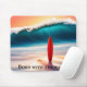 Upright orange surfboard on a sunrise beach with a big ocean wave and surfer quote.
