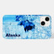 A blue and white image of a cow moose in an urban setting during winter. Customisable text reading, "Alaska" also appears.
