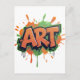 A bold graffiti-style typography artwork bursting with urban energy. The word “ART” explodes from a deep black background in vibrant orange, outlined with neon green accents. Paint splashes and dripping effects add movement and raw street-art attitude, symbolizing creativity without limits. The contrast of sharp lettering and fluid splatters reflects the fearless, expressive nature of modern art culture.