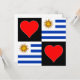 Cute square Uruguay greeting cards for proud Uruguayan people. With the a unique chequered pattern made from red hearts and the Uruguay national flag. Works great as an invitation for patriotic Uruguayan celebrations, reaching out to friends and family in Uruguay, or for patriotic arts and crafts projects!