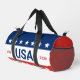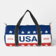 Celebrating the USA's 250th anniversary. These red, white, and blue duffle bags have the word 'USA' in the center. The years 1776 and 2026 are next to USA. The top stripe is blue and has white stars. The center stripe is white. The bottom stripe is red with white stars.