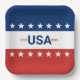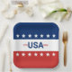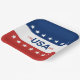 Celebrating the USA's 250th anniversary. These red, white, and blue paper plates have the word 'USA' in the centre. The years 1776 and 2026 are next to USA. The top stripe is blue and has white stars. The centre stripe is white. The bottom stripe is red with white stars.