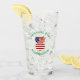 Drinking glass shows a red haired angel wearing the flag of the United States of America for holiday decorating or Christmas decor. The USA Flag Christmas angel is found surrounded by text allowing you to add your own text or personalise with a name and the year. Lettering is blue.