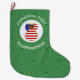 An African American angel wears the flag of the United States of America on this Christmas decor large Christmas stocking. The African American USA Flag Christmas angel is inside a white circle of squiggly squares, surrounded by a background of green squiggly squares. Add your own text or personalise with the year and a name.
