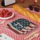 American Flag 1776 July 4th Party Paper Plates. Celebrate Independence Day with this patriotic USA flag with the year 1776 in white old English typography. Red, Navy Blue, and Off White Stars and Stripes Design. Order yours today with the matching napkins.