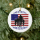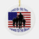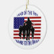 Beautiful American patriotic round tree ornament. This design is available on other shape ornaments as well. A wonderful way to show your American patriotic pride and support for U.S. troops, or to add to your patriotic ornament collection. The design features an American flag background, with a silhouette of soldiers in front. The main colours are red, white and blue and black. The ornament front reads, America... Land of the free.. Thanks to the brave.. The back reads, Merry Christmas and the year. You may edit back text in template area on this page. Please visit our store for other patriotic gifts and patriotic holiday items, shirts, and greeting cards, in different, styles, designs and colours.