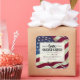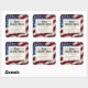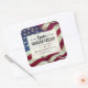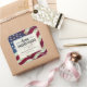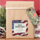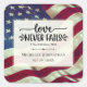 Patriotic USA Flag personalised wedding sticker depicts the red, white and blue American flag Stars and Stripes. It features Christian Bible Verse from 1 Corinthians 13:8, "Love never fails." Customise with couple's names and date.