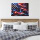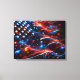 A vibrant depiction of the American flag features swirling patterns of red, white, and blue, with stars set against a dynamic background