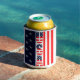 This custom can cooler features a design that displays the word "USA" surounded by the Stars & Stripes of the American flag print with a red, white, and blue colour scheme with an all over print style in this pride of the USA theme. Our can coolers fits any standard 12 oz cans and is customised on all sides including the bottom and made with high-density open-cell polyurethane collapsible foam material for easy storage.