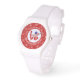 Wrist watch featuring red letters reading "LOVE" with a heart shaped USA or American Flag for the "O". Lovely anytime, but especially on Valentine's Day. Great way to share you love of your heritage on patriotic holidays. Red background has a fractal quality to its texture. A white circle is in the centre, also in a fractal. The design, the word LOVE is is the centre.