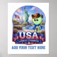 The design combines bold red, white, and blue typography with a charming cartoon traveler character, fireworks in the sky, and classic American symbols. Perfect for Independence Day, 4th of July celebrations, travel lovers, and anyone proud to represent the United States.