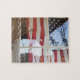 USA, Oregon, Shaniko. Flag in window next to Jigsaw Puzzle