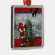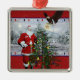 Beautiful holiday USA patriotic Santa Claus premium silver square ornament. This ornament features Santa decorating a Christmas tree, with an American eagle flying in to place the golden glowing star on top. The background is a wintery mountain scene, with a red snowing border on top. There are red, white and blue Christmas lights, and Santa is wearing an American flag patch on the front of his jacket. A wonderful addition to your holiday decorating, or gift giving would be a great gift for a veteran or someone currently in the military, or a collector. The art is displayed inside an elegant silver frame style ornament and also comes with a red ribbon to hang on your tree. This design is available on different shapes and styles of ornaments. For more military Christmas holiday themed styles of ornaments, gifts, stickers, tags, cards, stamps and much more please visit our store!
