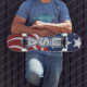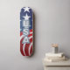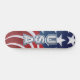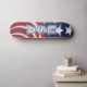 This patriotic skateboard has the stars and stripes of the American flag with silver USA text.