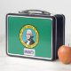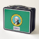 Show your patriotism with this Lunch Box featuring the Municipal Flag of the State of Washington USA with a licence plate on one side and the Star Spangled Banner with a name licence plate on the other side. The text name can be changed.
