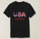 T-shirt features a bold, distressed graphic of the American flag, spanning across the chest. The colours are vibrant yet weathered, giving it a vintage feel. Above the flag, the words “Land of the Free” are emblazoned in a rugged, cursive font, while below, “Home of the Brave” is written in a strong, block typeface.