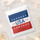 Celebrating the USA's 250th anniversary. This red, white, and blue favor bag has the word 'USA' in the center. The years 1776 and 2026 are next to USA. The top stripe is blue and has white stars. The center stripe is white. The bottom stripe is red with white stars.