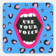 Use your voice! Speak up, even if your voice shakes. Leopard print background in blue and pink showcases a vibrant pink shouting mouth.