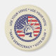 Round election magnet features Pro Democracy typography graphic of patriotic coloured centre Liberty Statue badge graphic with circular text that reads "Use your voice, use your vote, save democracy and vote blue.