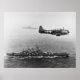 USS Washington passed by SBD Dauntless fighter plane. Aircraft carrier in distance.