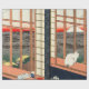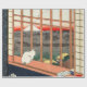 Ukiyo-e print shows a cat sitting on a wall where the sliding panels have been opened, watching the festival procession in the rice paddies nearby, with view of Mount Fuji in the distance.