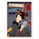 This is a Japanese colour print by the artist Utagawa Kuniyoshi (19th century). He created a lot of prints featuring women, and this is another one in the series. In this print we see a Japanese woman, dressed in the traditional Japanese kimono (with a lovely black and white pattern decorating it), while reading a book. Books in Japan in those days were also printed, both the writing and the pictures. Behind her there is a painting (or a print) of what looks like a Japanese fisherman working by the river. Red, blue, yellow, gold and green colours were also used in this artwork. Utagawa signed the print in Kanji characters and Hiragana (Japanese writing).
