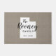 Modern farmhouse personalised doormat with your family name inside your state map. Faux burlap canvas texture background. Click Customise It to add your own text and images and create a unique one of a kind design!