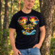 I give wanted to give this a 4 instead of a 5 because these Basic DARK T0shirts run unexpectedly SLIM or Narrow. Which is great if you do not have a potbelly, but I have a paunch. It isn't the shirt's fault that I've got a beer belly. The design and shirt itself is a quality cotton shirt. The color is more of a deep purple, but still a very pretty color. The Basic DARK T-shirts run a bit SLIMMER than the Basic Ts. The neck is a fraction narrower (or seems to be narrower) also. I'm a paunchy middle-aged woman and my neck is 12 inches (31cm) thick and the neckline fell about the same as in the photo of the man, and I had the desire to tug it a bit. So if you're a thick necked man or like loose shirts, be aware these are slimmer shirts. Once I get rid of my lockdown paunch it'll look great. The shirt washed well in cold water with no apparent bleeding. We don't have a dryer, so it hung dry. Did not shrink. Love the colors and the design. The design looks smaller on my shirt than it does on the model on-line. But still, it looks good on the shirt. The printing looks as it does on the model, just the size seems fractionally smaller. Washed garment in cold water, hung dry and design appeared unaffected.