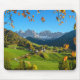 Mousepad with the village of St. Magdalena or Santa Maddalena with the characteristic church in front of the Geisler or Odle Dolomites mountain peaks in the Val di Funes valley (Villnoesstal) in Italy in autumn surrounded by autumn leaves.