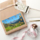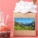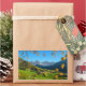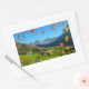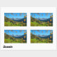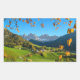 Rectangular photo sticker of the village of St. Magdalena or Santa Maddalena with the characteristic church in front of the Geisler or Odle Dolomites mountain peaks in the Val di Funes valley (Villnoesstal) in Italy in autumn surrounded by autumn leaves.
