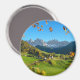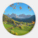 Round souvenir photo magnet with the village of St. Magdalena or Santa Maddalena with the characteristic church in front of the Geisler or Odle Dolomites mountain peaks in the Val di Funes valley (Villnoesstal) in Italy in autumn surrounded by autumn leaves.