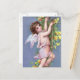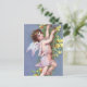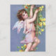 A charming vintage Valentine postcard featuring a cute angel on a rope ladder in front of a rose bush.