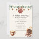 Celebrate a special "baby is brewing" moment with this charming baby shower invitation, perfect for a Valentine's Day celebration. The design features a delicate eucalyptus garland with adorable heart-shaped baby clothes hanging, accompanied by a cozy coffee mug and a bag of coffee beans. The warm, earthy tones and watercolor illustrations create a rustic and inviting atmosphere. This invitation is ideal for honoring the mom-to-be with a theme that blends the excitement of a new arrival with the warmth of a coffee break.