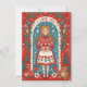 Whimsical Valentine-style illustration featuring a girl with braided hair, a red sweater, and a tulip-print dress, framed by a floral border. She holds a gift as stars and hearts surround her.