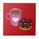 Illustration of a chocolate frosted doughnut topped with heart sprinkles and served with a mug of coffee in a pink mug with a heart.