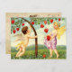 Vintage illustration of a young Valentine Fairy and her cherub friend, picking red hearts, which are growing on a tree. While he shakes the hearts from the tree, she gathers them. Such a cute Valentine's Day postcard!